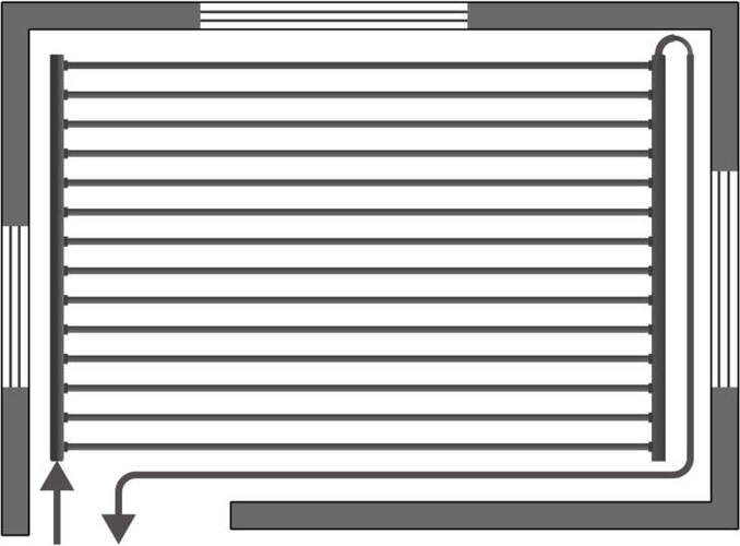 Tento princip zaručuje, že voda urazí ke každé části stěny vždy naprosto stejnou vzdálenost. Tím automaticky odpadá problém s nerovnoměrným průtokem a systém je přirozeně vyvážený. Výsledek? Stěna hřeje i chladí v celé ploše rovnoměrně, s konstantní povrchovou teplotou v každém bodě.