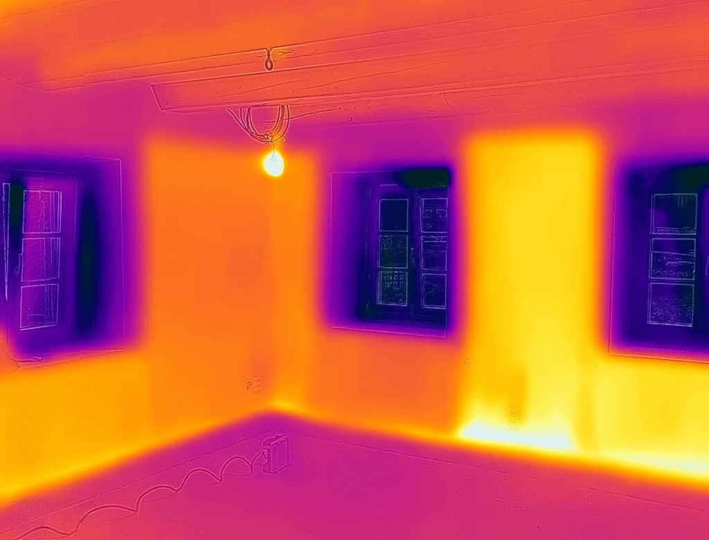 Tyto termovizní snímky ukazují rozložení teploty na nainstalované Klimastěně® (strop i stěna). Díky Tichelmannovu zapojení je teplo distribuováno bez teplotních výkyvů, což je klíčové pro maximální komfort a úsporu energií.