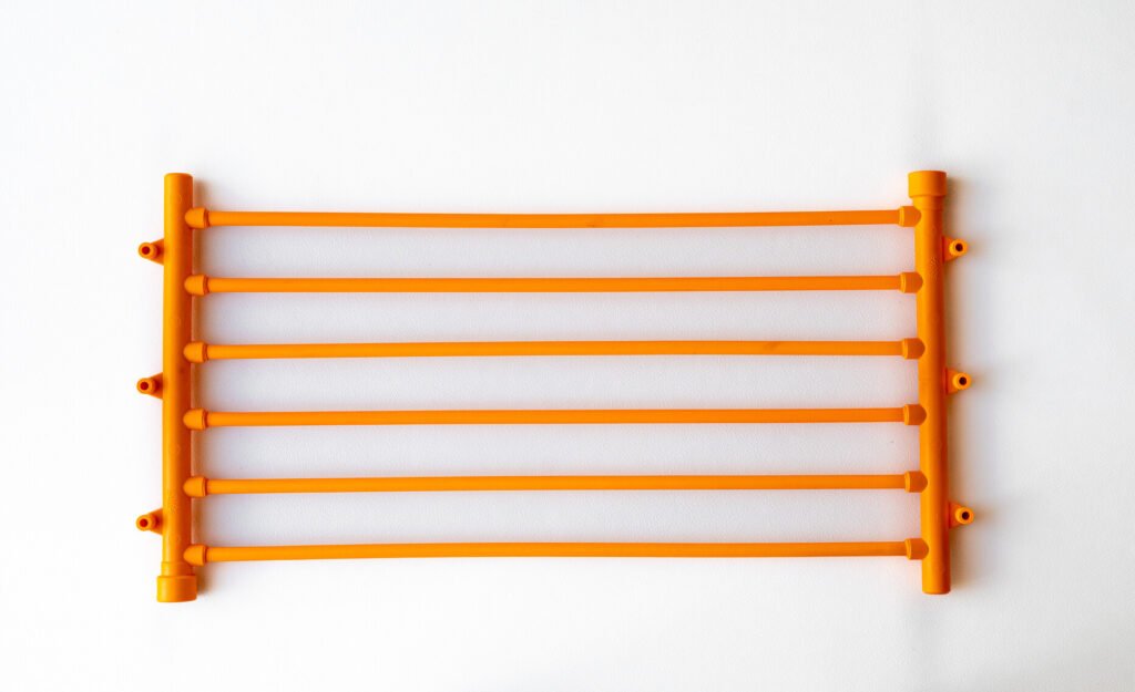 Každý topný registr tvoří síť tenkých trubiček o průměru 10 mm (pro efektivní předání tepla), které ústí do sběrného potrubí o průměru 20 mm. Pevnost konstrukce zajišťují integrované upevňovací konzole.
